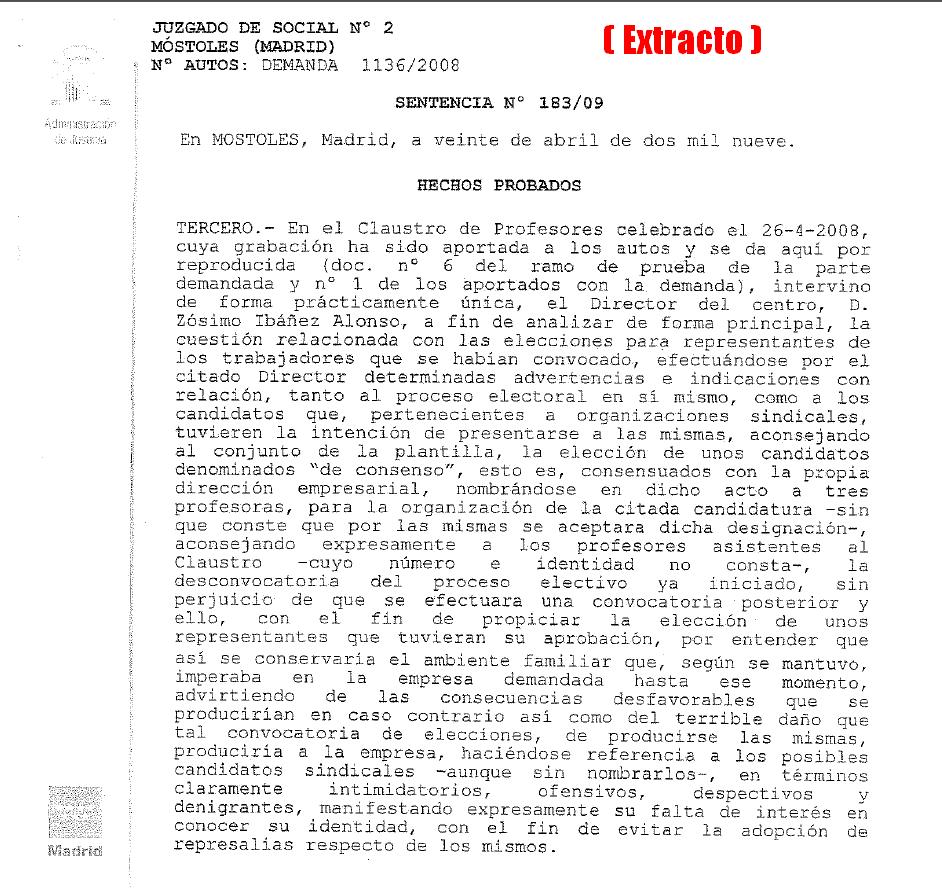 Resulta que cuando empezaron a organizar las Elecciones Sindicales y el Comité de Empresa durante el años 2008, el director del Establecimiento Zósimo Ibáñez Alonso intento detener el proceso, amenazando de represalias a los trabajadores, exigiendo que los representantes de los trabajadores tengan el visto bueno de la dirección empresarial. Cuando por fin se logro realizar las elecciones, los 91 empleados eligieron a estos cinco representantes del FSIE y a dos de otro sindicato.
